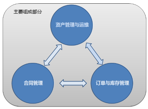 E-IMP系统平台由以下3个主要部分组成,资产管理与运维、合同管理、订单管理。3个组成部分的共同运行可以实现数据的闭环,满足运维人员的基于不同层面的绝大部分的需求。